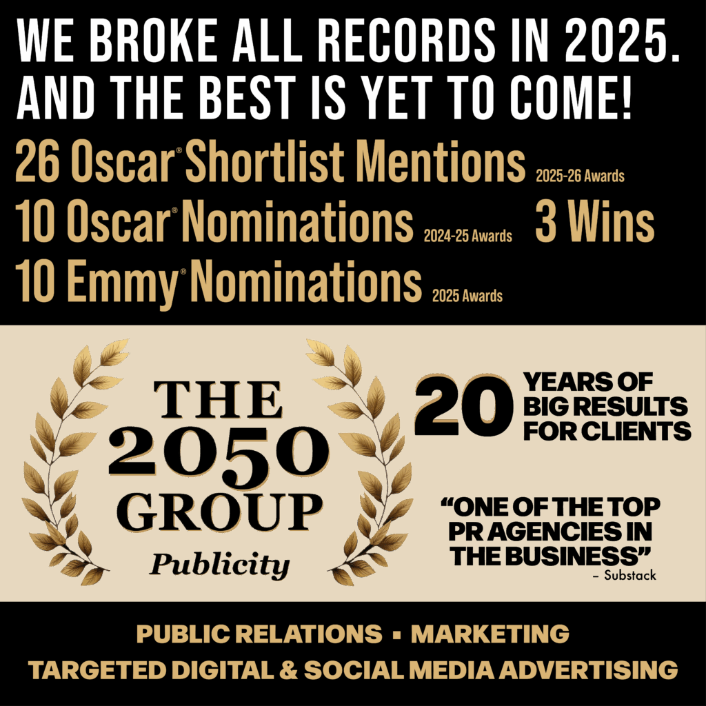 The 2050 Group – Publicity’s Digital & Social Media practice has spearheaded highly successful campaigns for a diverse range of exceptional clients. Our work has contributed to the visibility and impact of award-winning content, including Oscar® and Emmy®-winning films and series, such as the 2025 live action short Oscar® winner I’m Not a Robot and the 2024 documentary short Oscar® winner The Last Repair Shop.